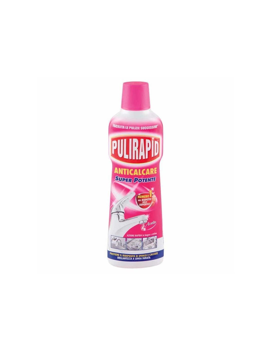 Pulirapid Anticalcare elimina facilmente anche il calcare più ostinato, macchie d'acqua, ruggine e sapone. Grazie alla sua formula rispetta le superfici e le rende più brillanti, previene il Ri deposito del calcare e dello sporco, facilitando le pulizie successive, per un pulito a nuovo in bagno e in cucina.