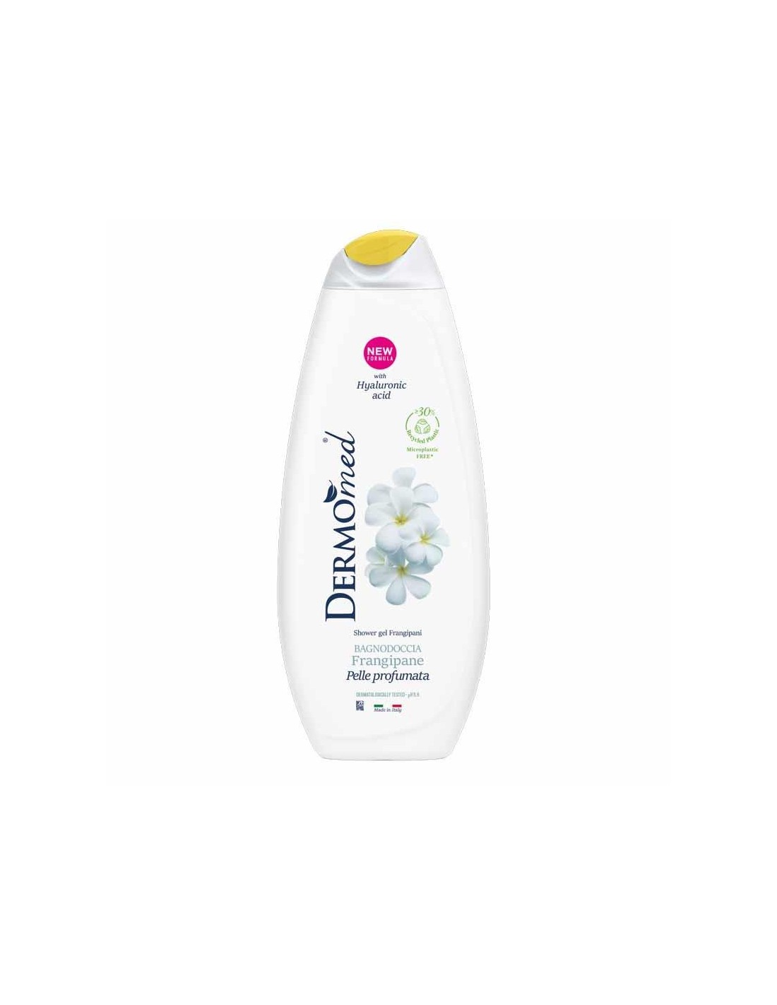 Dermomed bagnoschiuma Francipane, rispetta la pelle, anche quella più delicata, rendendola profumata, morbida e setosa. Con acido ialuronico, pH 5.5 e senza microplastiche. Dermatologicamente testato. Confezione da 650 Ml.
