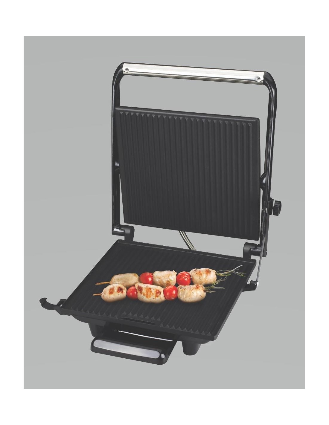 Piastre anti aderenti Luce di controllo accensione e pronta per la cottura. Controllo dell’altezza regolabile, facile meccanismo di chiusura. Protezione contro il surriscaldamento. Controllo del termostato, Struttura in acciaio inox,con comodo vano raccogli olio.