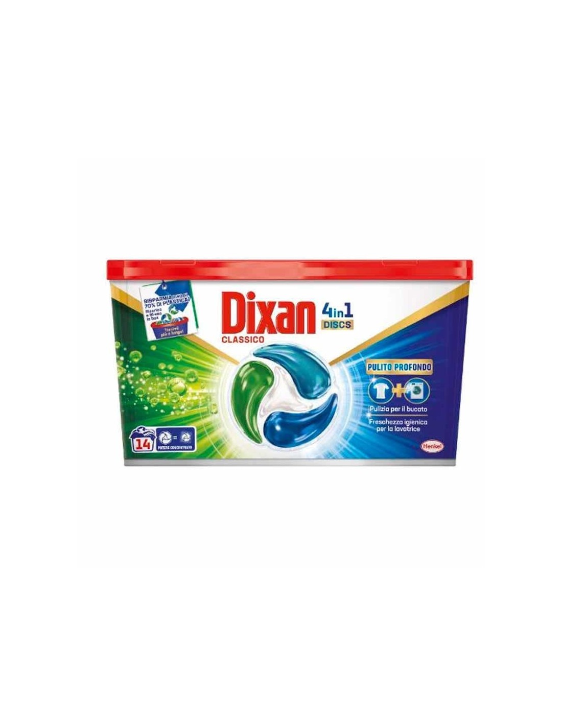 Detersivo in capsule dixan disc 4 in 1 classico, freschezza igienica per la lavatrice, grazie alla tecnologia pulito profondo che ha cura dei tuoi capi impeccabili. Azione pulente attiva delicato sui capi. Lava, smacchia e dona brillantezza e sono particolarmente indicate per il bucato colorato ideale per il bucato di tutti i giorni.