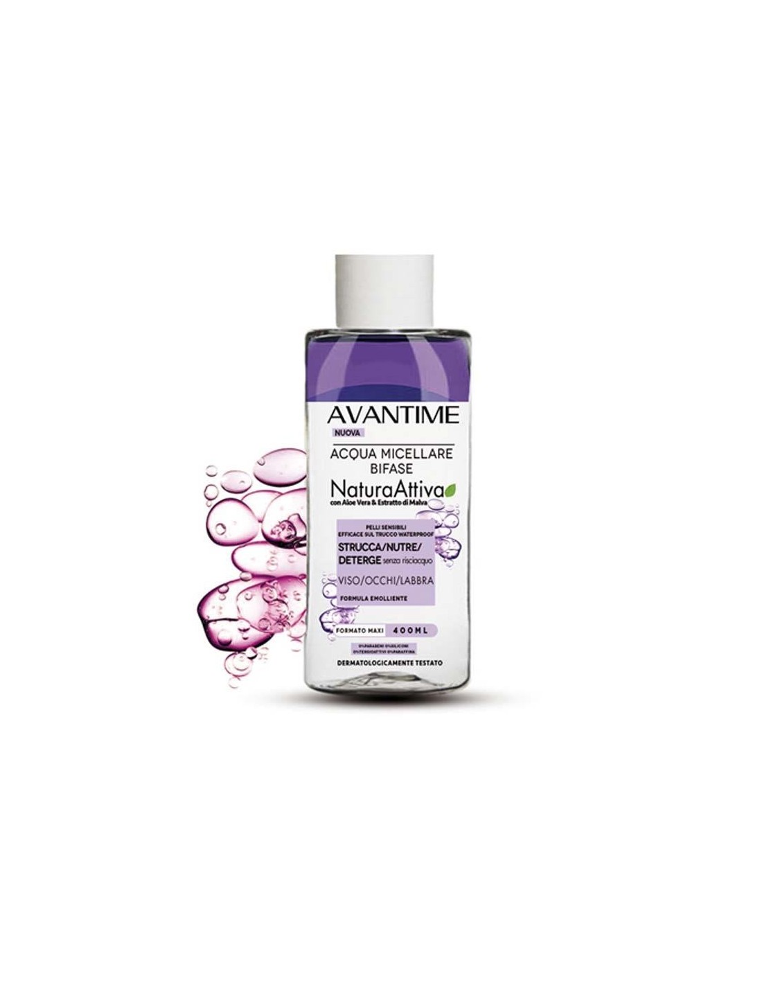 Acqua miscellare con Aloe Vera ed estratti di Malva, ideale per pelli sensibili. Nutre e deterge la pelle rendendola morbida, asciutta e setosa, grazie anche all' azione combinata di Aloe Vera e estratti di Malva, ottimi emolienti ed antinfiammatori e all' aggiunta di Pantenolo, estratto di carota e acido lattico. La nuova acqua micellare bifase Avantime rimuove tutte le tracce di Make Up Waterproof senza aggreddire la pelle.