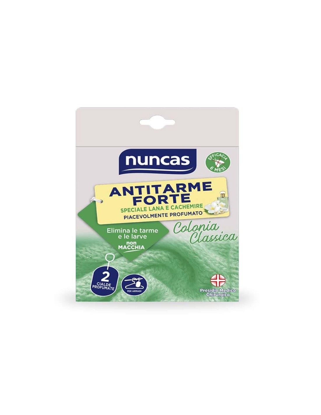 Anti Tarme Forte è un Presidio Medico Chirurgico autorizzato dal Ministero della Salute che protegge in modo efficace e per lungo tempo i capi in lana dall’attacco delle tarme. La sua formulazione mentre elimina le tarme adulte e previene la deposizione di nuove uova, agisce con efficacia immediata sulle larve già presenti, che per crescere si nutrono della lana e sono responsabili dei danni ai tessuti e impedisce alle uova di schiudersi. È un tarmicida che può essere utilizzato per disinfestare armadi e cassetti già invasi dalle tarme – bastano alcuni giorni per eliminare tutto - ma soprattutto per impedire l’ingresso di nuovi insetti. Nuncas ha aggiunto alla formula raffinate profumazioni che rinfrescano e mantengono profumati i capi per una intera stagione.