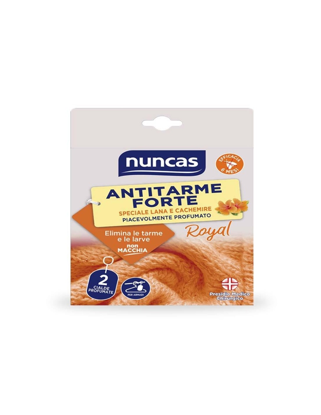 Anti Tarme Forte è un Presidio Medico Chirurgico autorizzato dal Ministero della Salute che protegge in modo efficace e per lungo tempo i capi in lana dall’attacco delle tarme. La sua formulazione mentre elimina le tarme adulte e previene la deposizione di nuove uova, agisce con efficacia immediata sulle larve già presenti, che per crescere si nutrono della lana e sono responsabili dei danni ai tessuti e impedisce alle uova di schiudersi. È un tarmicida che può essere utilizzato per disinfestare armadi e cassetti già invasi dalle tarme – bastano alcuni giorni per eliminare tutto - ma soprattutto per impedire l’ingresso di nuovi insetti. Nuncas ha aggiunto alla formula raffinate profumazioni che rinfrescano e mantengono profumati i capi per una intera stagione.
