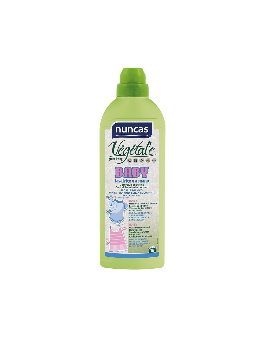 Nuncas Baby agisce contro lo sporco tipico dell’infanzia residui organici, vomito, macchie da cibo già alle basse temperature e grazie alla presenza di ingredienti naturali emollienti derivanti dalla barbabietola da zucchero lascia i capi morbidi senza necessità di aggiungere ammorbidenti. E’ arricchito con Tea Tree oil dalle proprietà antimicrobiche per eliminare anche gli odori più sgradevoli. La speciale formula ipoallergenica non contiene profumo né conservanti e il contenuto di nichel è inferiore alla soglia sotto la quale anche un soggetto sensibile non manifesta alcuna reazione allergica.