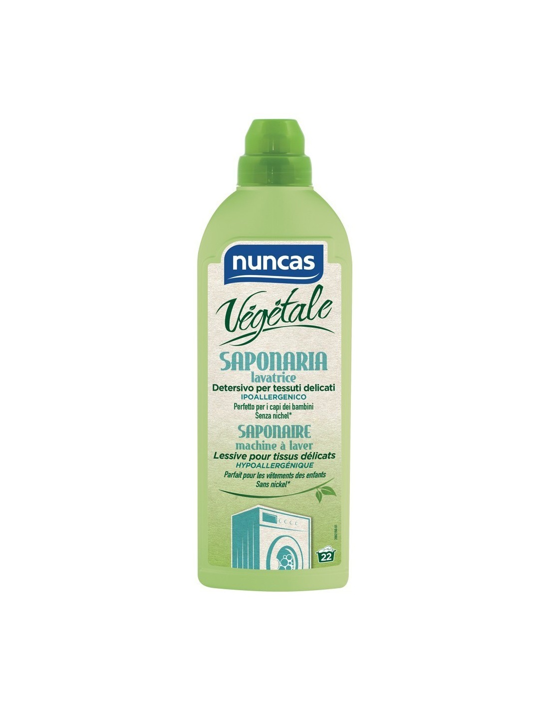 Saponaria detersivo ipoallergenico ecologico concentrato ideato per il lavaggio dei capi delicati in lavatrice. Saponaria Nuncas garantisce un bucato perfetto e senza aloni, conservando inalterati nel tempo fibre e colori. Saponaria lavatrice è un detersivo ecologico liquido per lavatrice, attento alla salute della pelle. Come tutti i prodotti Nuncas Vegetale è dermatologicamente testato e ipoallergenico, non contiene sostanze allergizzanti di alcuna natura conservanti o profumi e il nichel presente nel prodotto è inferiore alla soglia sotto la quale anche un soggetto sensibile non manifesta una reazione allergica. Una caratteristica particolarmente importante, anche se poco tangibile, è la completa risciacquabilità al termine del ciclo di lavaggio il detersivo liquido viene rimosso in modo completo, per non irrigidire le fibre ma soprattutto per evitare il contatto con sostanze chimiche. Indispensabile per lavare tutto il corredo dei neonati rispettando la loro pelle sensibile e delicata.