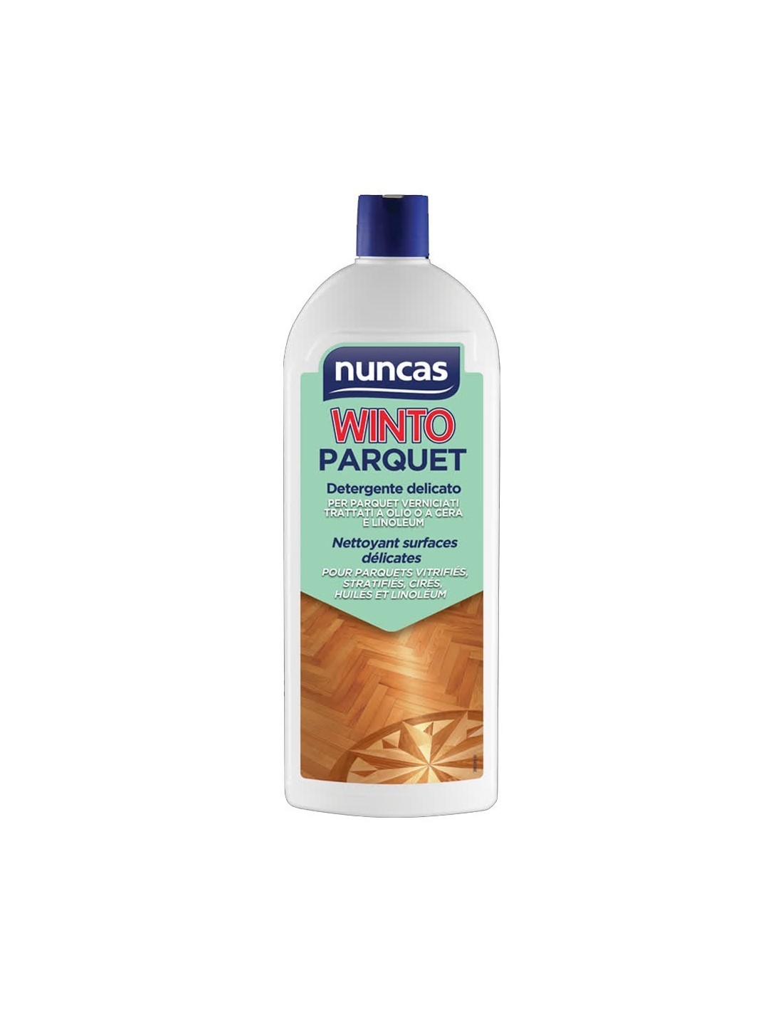 Winto Parquet nella gamma Nuncas di prodotti per la casa è un detergente specifico per la pulizia quotidiana dei pavimenti in legno, che deterge a fondo nel totale rispetto delle superfici. La sua formulazione - arricchita con sapone di cocco e priva di solventi non opacizza e non rimuove la finitura dei parquet verniciati mantenendo inalterata questa protezione impermeabilizzante che previene l’assorbimento di macchie e sporco. Utilizzato su parquet naturali non rimuove durante la pulizia i trattamenti a olio o cera e mantiene la normale idratazione del legno.