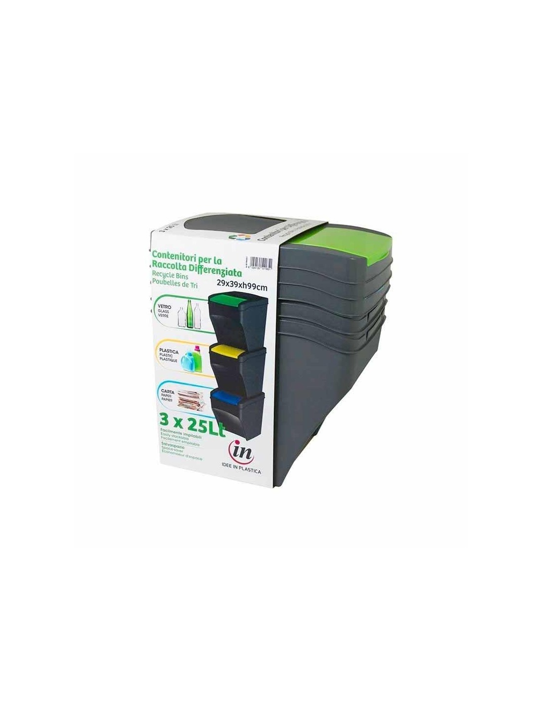 Pattumiera per la raccolta differenziata componibile e modulare per essere liberi di deciderne la posizione. Permette l utilizzo di svariate forme di sacchetti. Disponibile nel set da 3pz. con coperchi colori assortiti, i quali rendono autentico elemento di arredo. Set composto da 3 contenitori. Capacità 3 x 25 Lt.