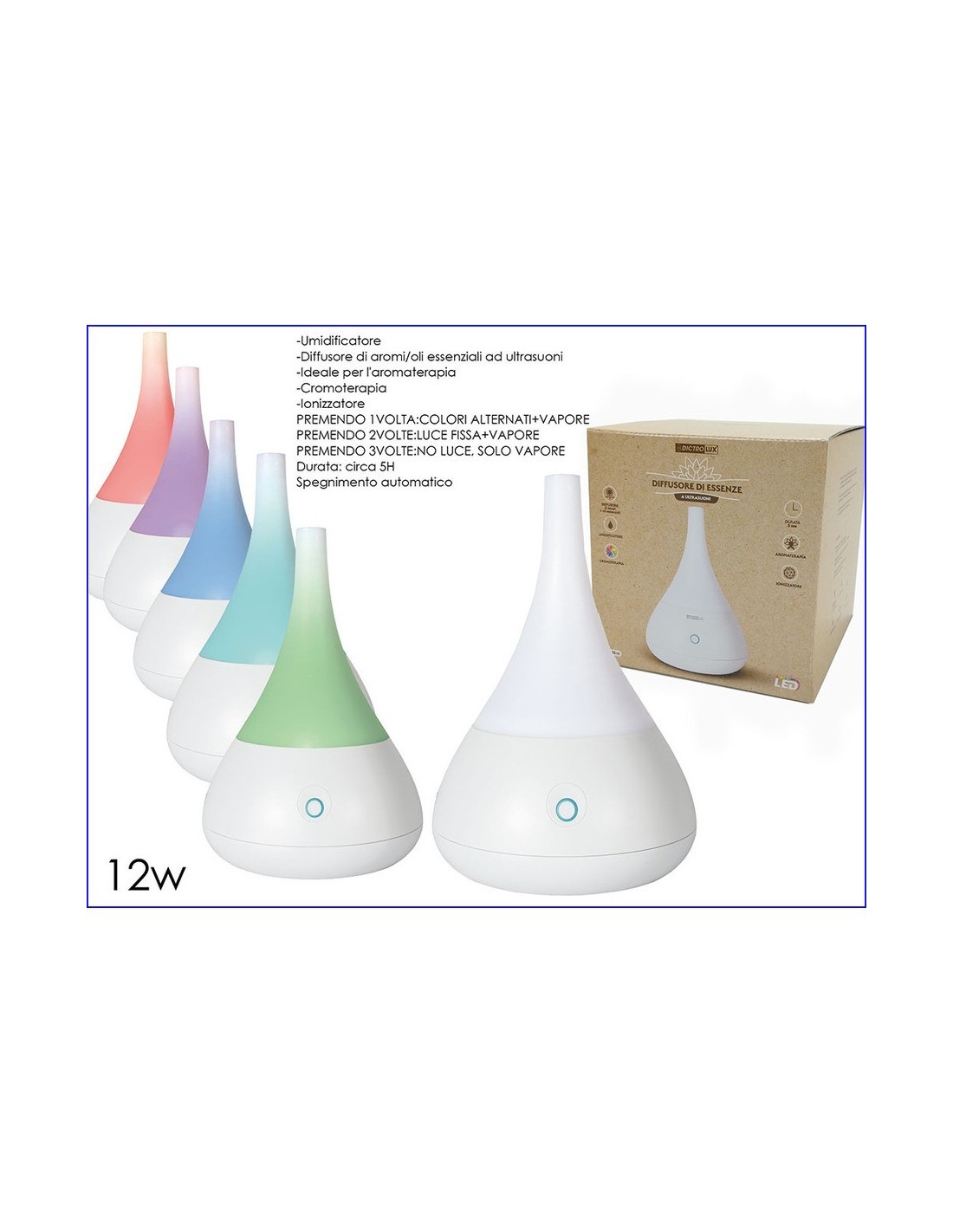 Diffusore di essenze ad ultrasuoni 12 watt. Un’ottima soluzione per profumare e creare un ambiente di relax e benessere. Diffusore di aromi e oli essenziali, umidificatore, aromaterapia, cromoterapia variazione di 4 colori. Funzioni colori alternati piu vapore, luce fissa piu vapore, solo vapore. Capacità 120 ml