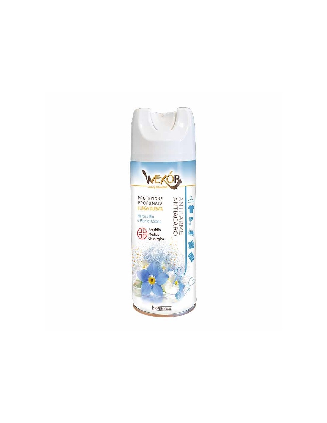 Lo spray Antitarme Antiacaro Narciso Blu Wexór è un Presidio medico Chirurgico certificato dal ministero della Salute. Garantisce un guardaroba sempre protetto e profumato! Ideale per capi d’abbigliamento, tende, tappeti, cuscini, materassi etc.